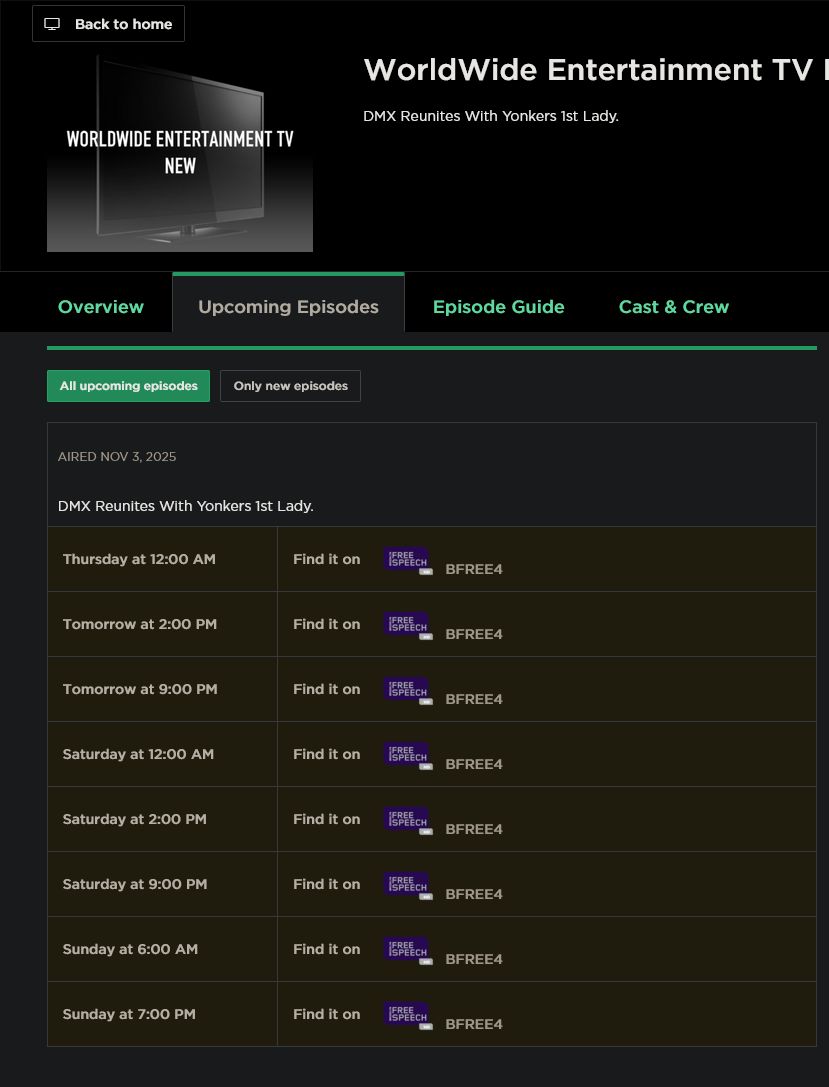 WorldWide Entertainment TV airs on BRIC TV / Brooklyn Free Speech HD on the following schedule: